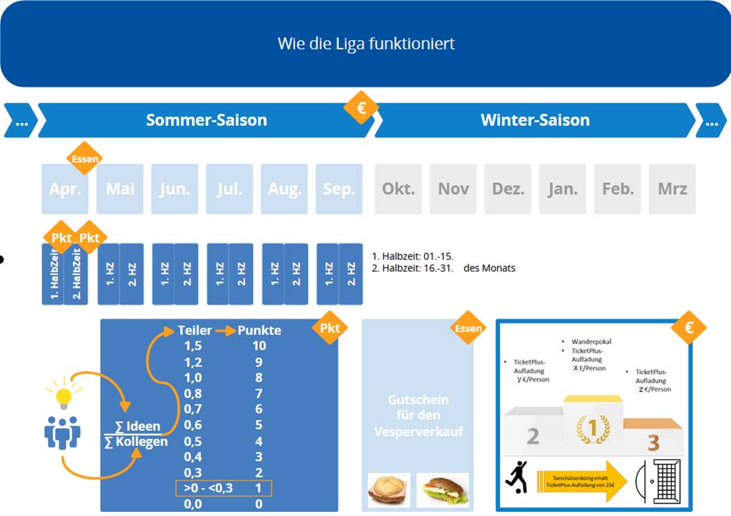 Die Motivation zur Teilnahme am Team-KVP wird zusätzlich durch Gamification unterstützt: In einer „Liga“ treten die Teams gegeneinander an. Die Position im Ranking der Liga ergibt sich aus der Anzahl von Punkten, die alle zwei Wochen entsprechend der Anzahl eingereichter Team-KVP-Ideen pro Teammitglied vergeben werden.