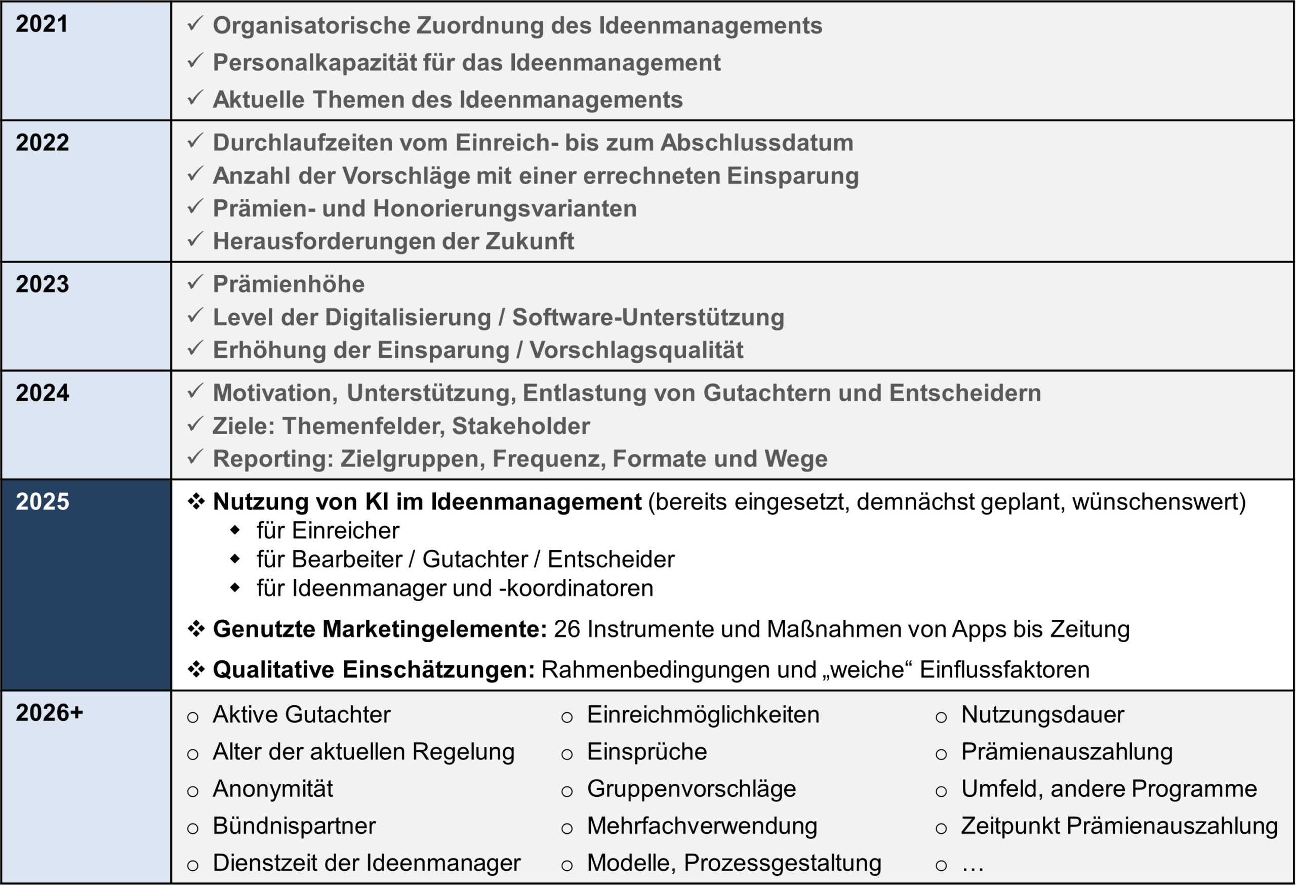 - Der nun anstehende Kennzahlenvergleich 2025 wird Ihnen aufzeigen, wo der Einsatz von KI im Ideenmanagement den größten Nutzen stiftet, welche Marketinginstrumente und -aktivitäten am wirkungsvollsten sind und wie sich qualitative Rahmenbedingungen in den Kennzahlen widerspiegeln.