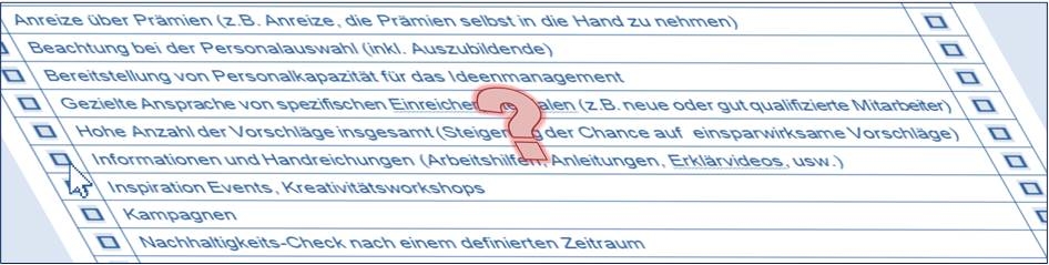 Im Datenblatt für den „Kennzahlenvergleich Ideenmanagement 2023“ wird abgefragt, welche Ansatzpunkte von den Unternehmen zur Erhöhung der Einsparung / Vorschlagsqualität genutzt werden, und welche davon eine erkennbar positive Wirkung haben. Per Mausklick können folgende Möglichkeiten ausgewählt und bewertet werden:
