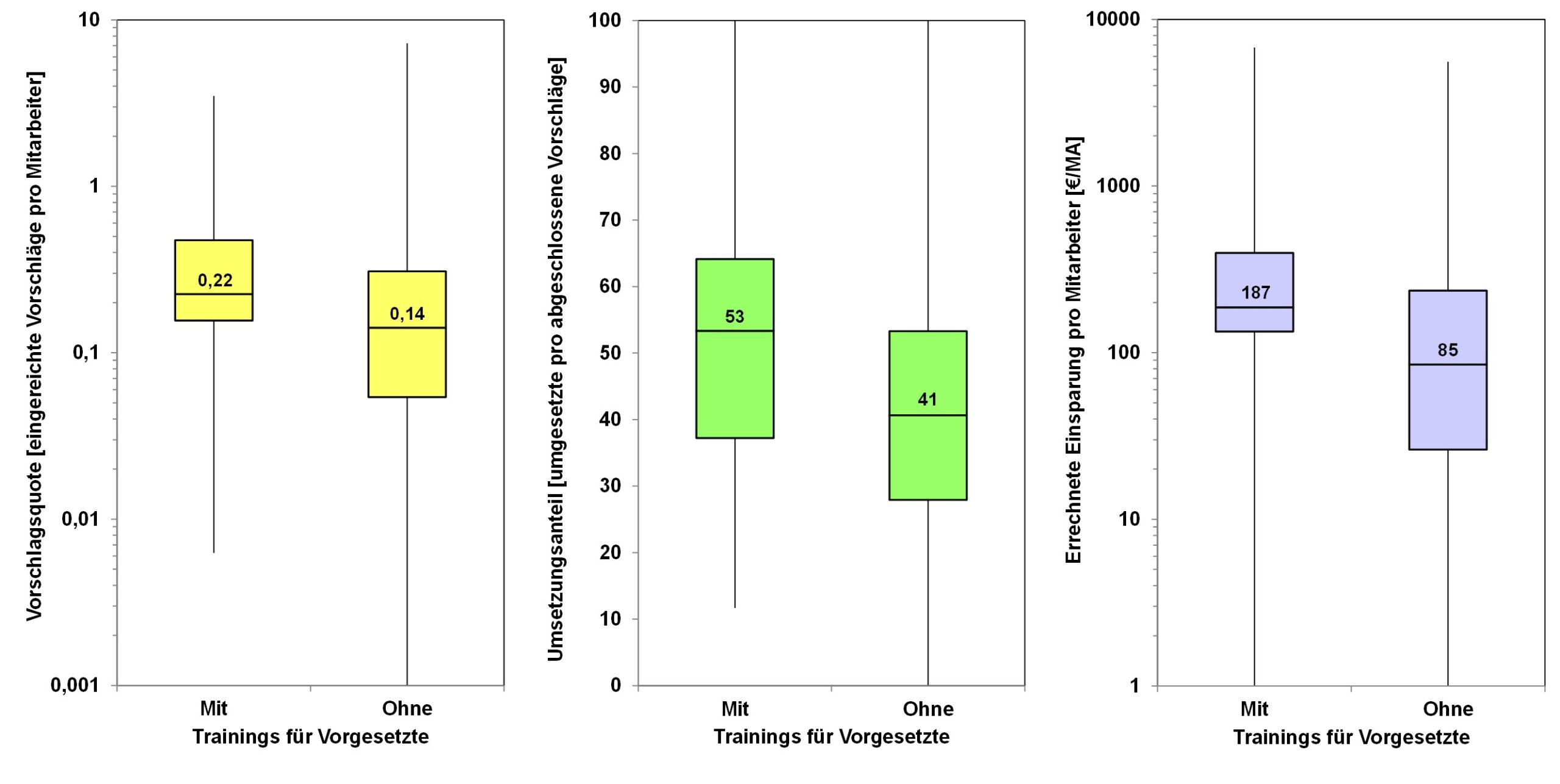 Abb. 2: Vergleich der Boxplotdiagramme für Vorschlagsquote, Umsetzungsanteil und Einsparungsquote zwischen Unternehmen mit und ohne „Trainings für Vorgesetzte“