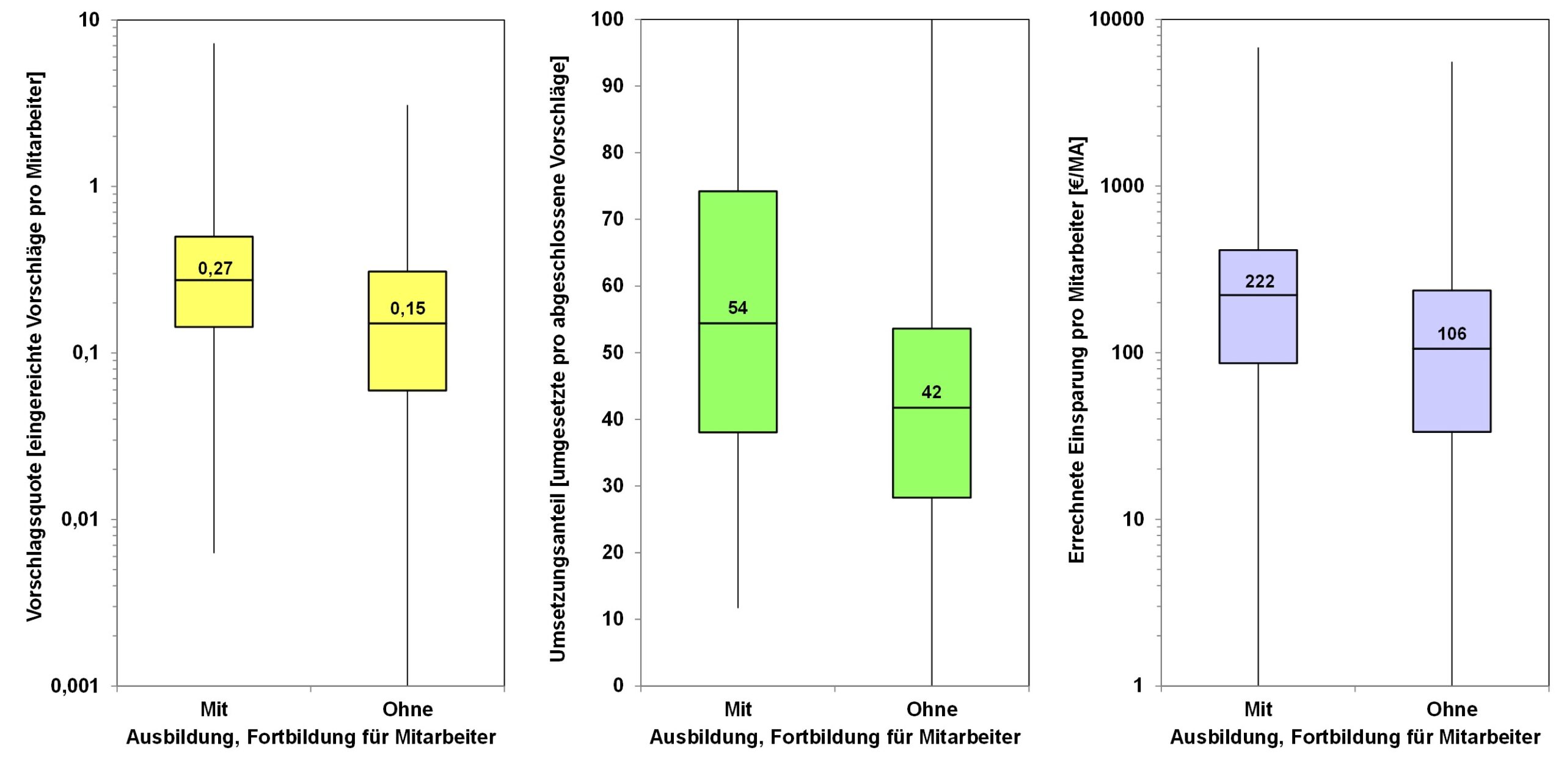 Abb. 3: Vergleich der Boxplotdiagramme für Vorschlagsquote, Umsetzungsanteil und Einsparungsquote zwischen Unternehmen mit und ohne „Systematische Ausbildung, Fortbildung für Mitarbeiter“