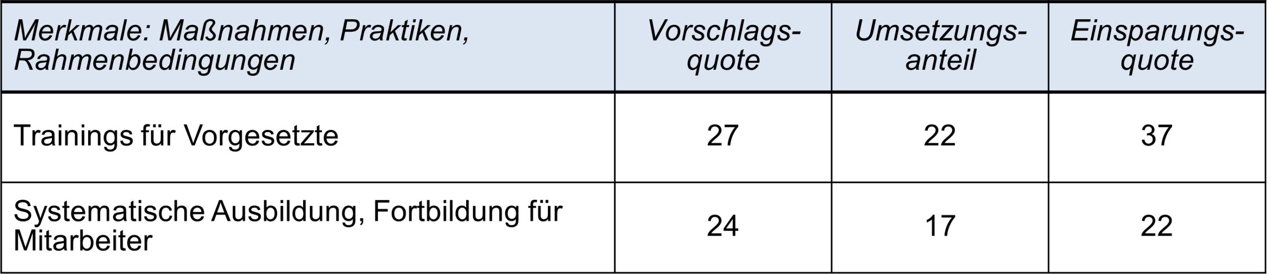 - Von den Unternehmen, die „Trainings für Vorgesetzte“ durchführen, haben 71% eine Vorschlagsquote oberhalb des Medianwerts von 0,16 VV/MA.
