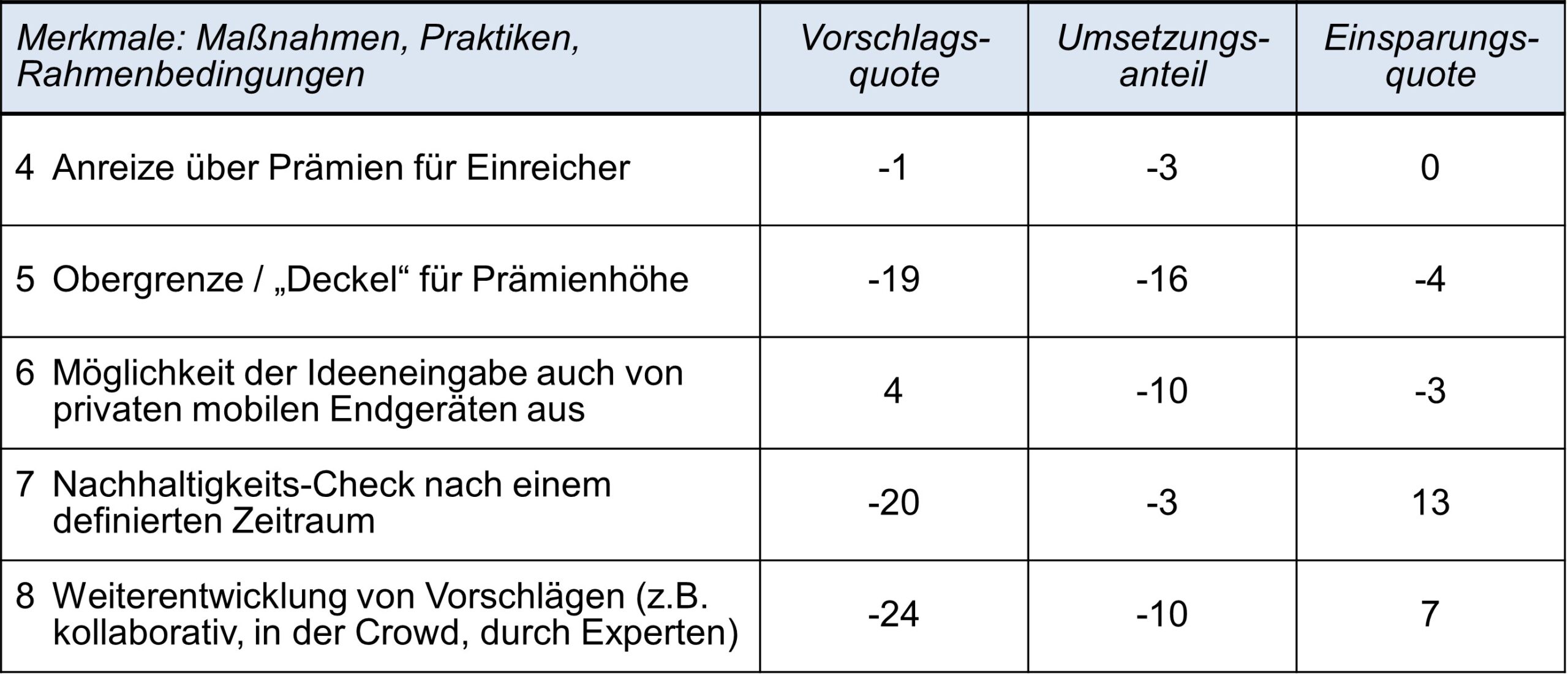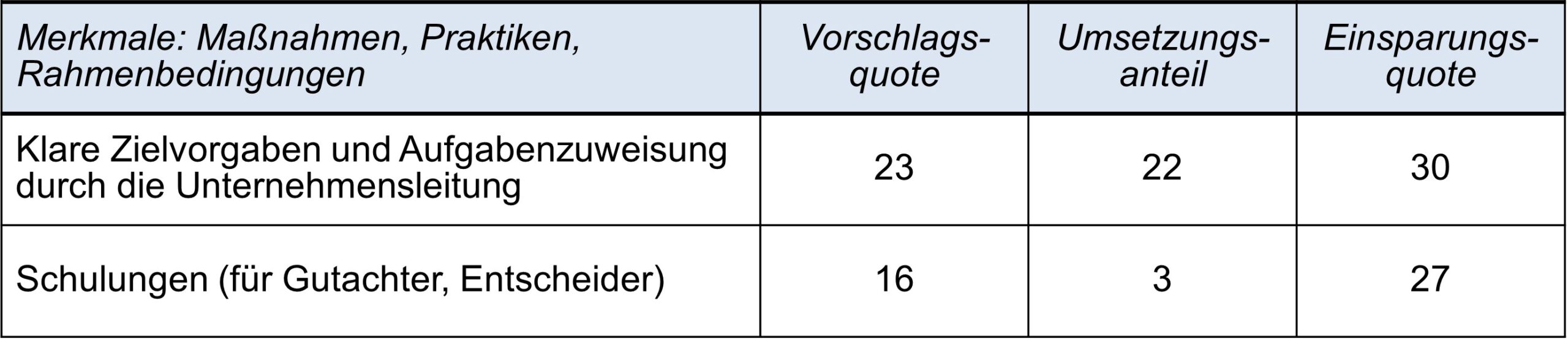 - Dass dies gelingt, zeigt sich daran, dass die meisten Unternehmen, die diese Maßnahmen durchführen, bei der Vorschlagsquote zur unteren Hälfte gehören, aber bei der Einsparungsquote wieder vermehrt in der oberen Hälfte zu finden sind (und das, obwohl eine geringere Vorschlagsquote ansonsten tendenziell eher mit einer geringeren Einsparungsquote einhergeht: die „Zusammenhangsstärke“ zwischen Vorschlags- und Einsparungsquote beträgt 36, siehe Tabelle 3).