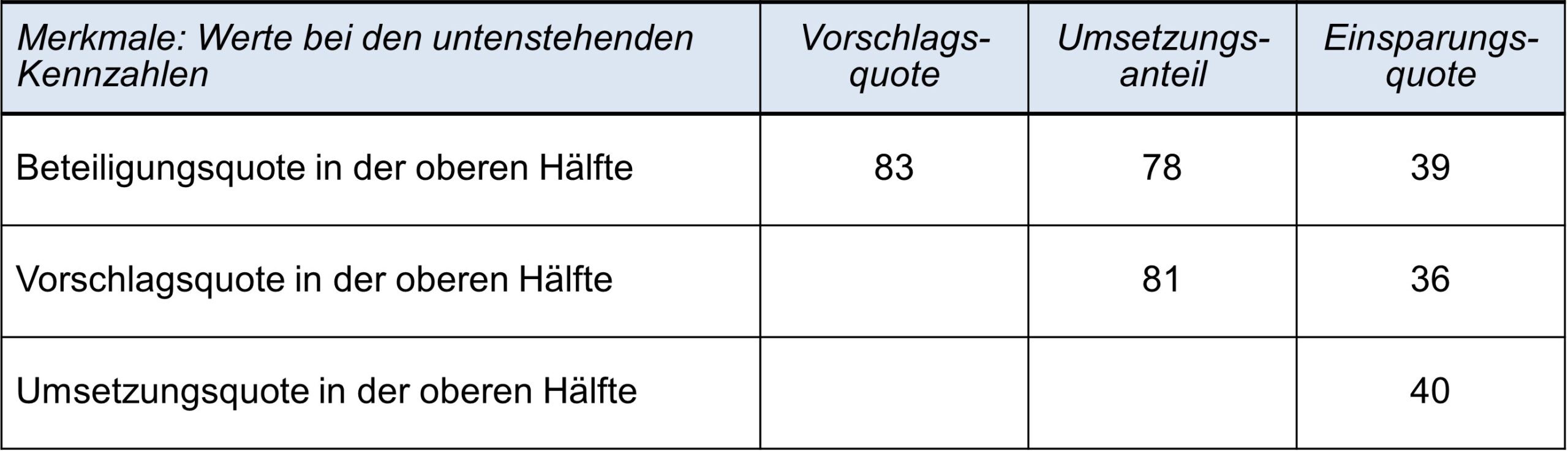 Beispiel 3 „Beteiligungs-, Vorschlags- und Umsetzungsquote“: Die weitaus stärksten Zusammenhänge zeigen sich zwischen den Beteiligungs-, Vorschlags- und Umsetzungsquoten. Von den Unternehmen, die bei einer dieser Kennzahl zur oberen Hälfte gehören, finden sich über 80% auch bei den anderen beiden Kennzahlen in der oberen Hälfte.