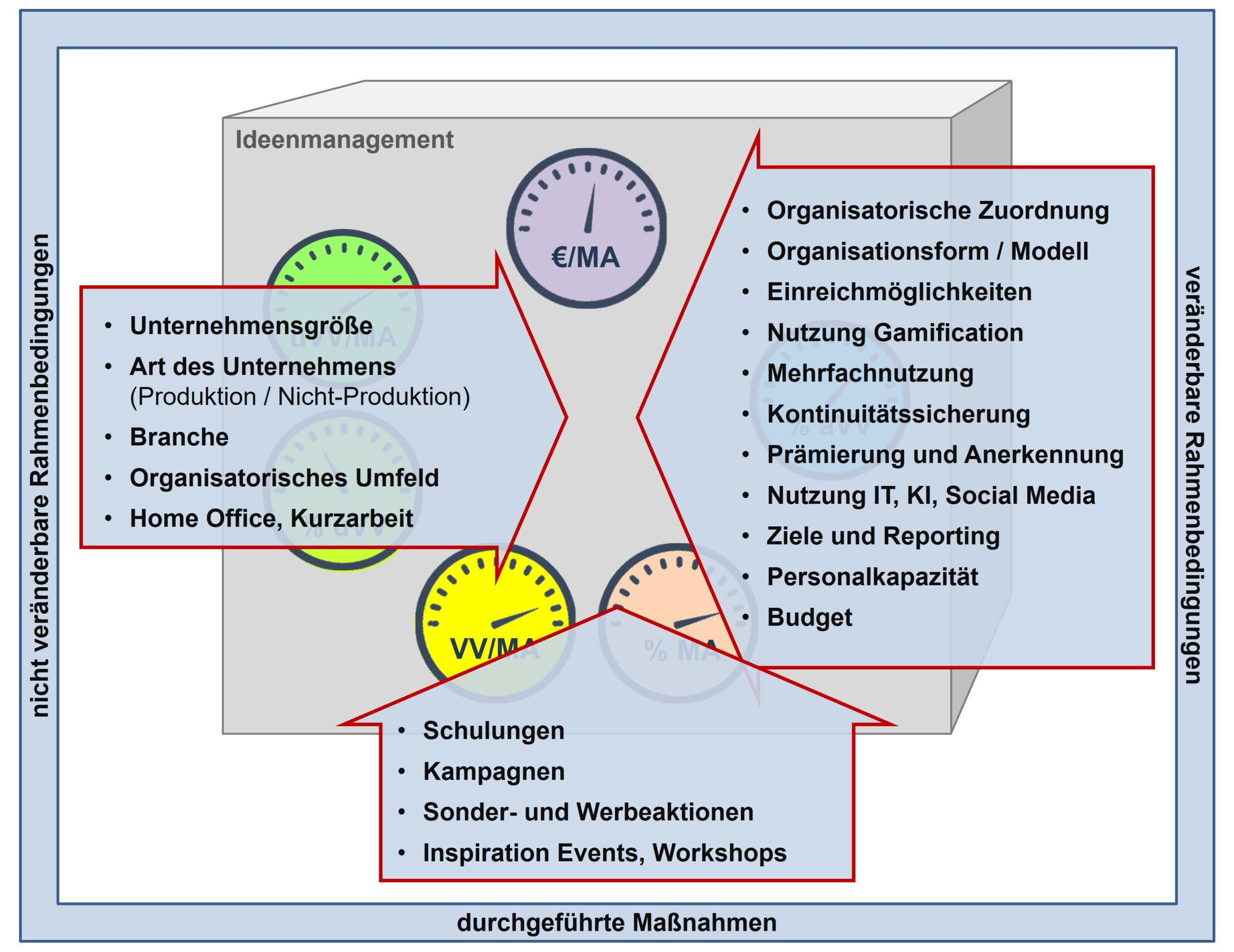 Abb. 4: Ideenmanagement als „Black Box“ mit „Messgeräten“ für die Beteiligungsquote [% MA], die Vorschlagsquote [VV/MA], den Umsetzungsanteil [% uVV], die Umsetzungsquote [uVV/MA], die Einsparungsquote [€/MA] und den Abarbeitungsanteil [% aVV] – eingebettet in ein Umfeld aus Rahmenbedingungen und Maßnahmen